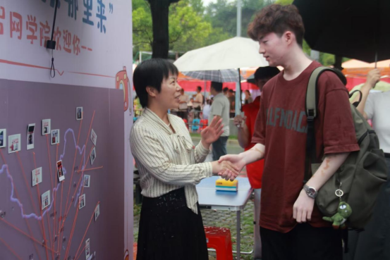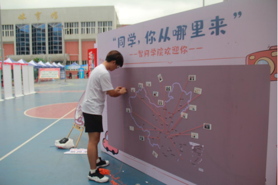 活动现场的生源地图互动展示环节充满趣味与意义。学院规定,每个班级在6号早上最早报到的新生,可获得拍立得照片一张。新生们手持照片,在生源地图上找到家乡所在的位置并将照片悬挂其上。