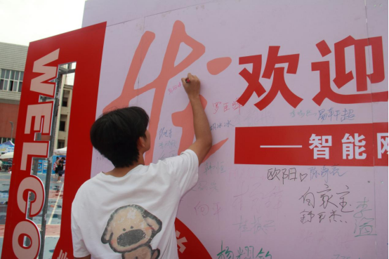 在报到点附近,学院精心布置了以文化为主题的新生签名墙。新生们纷纷驻足,用签名、班级信息或对未来的寄语,留下自己在学院的第一个“专属印记”。