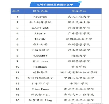 2025 年 “黄鹤杯” 网络安全人才创新大赛江城校园新星赛于近日公布晋级决赛名单,湖北汽车工业学院在此次比赛中表现亮眼。在公布的 16 支晋级决赛的团队中,湖北汽车工业学院共有 3 支团队成功入围。展现了学校在网络安全教育与人才培养方面的扎实成果。
