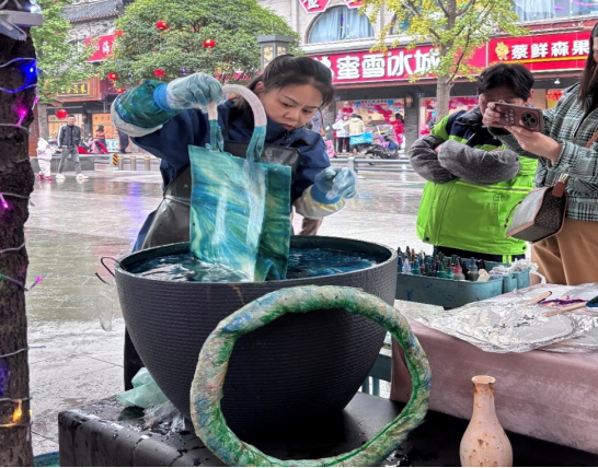 本次研学的核心亮点在于深度的互动体验。活动专门设置了多个互动体验区,并邀请到多位非遗传承人现场指导。在传承人的耐心讲解和示范下,学生们纷纷动手,亲身体验了武当官密古法琉璃制坯的艰辛与神奇,感受着陶瓷手串DIY的乐趣,尝试了中式盘扣的指尖艺术,以及木版画的拓印技巧。在扎染体验区,同学们将白布通过捆扎、浸染,创造出独一无二的蓝白图案,每一件作品都充满了惊喜。这些动手环节让书本上“非物质文化遗产”的概念变得可触、可感、可参与,极大地激发了大家的兴趣与热情。