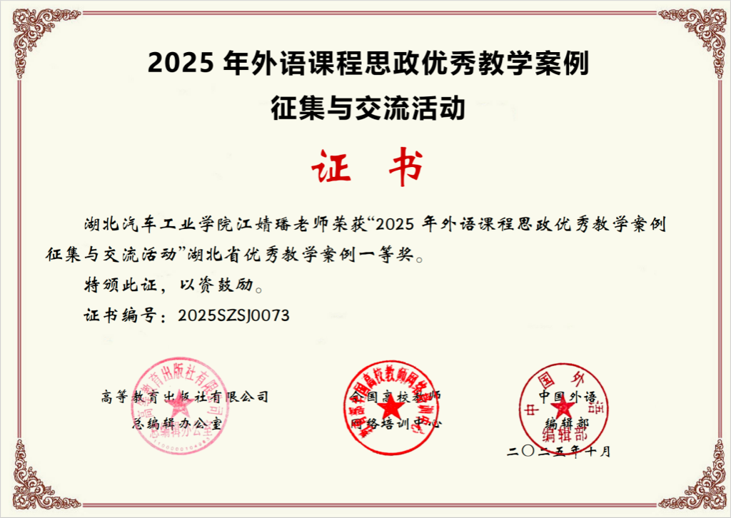 近日,由高等教育出版社、全国高校教师网络培训中心和《中国外语》编辑部联合举办的“2025年外语课程思政优秀教学案例征集与交流活动”,公布了省级优秀教学案例名单,437必赢会员中心437必赢会员中心江婧璠老师的参赛案例,从众多作品中脱颖而出,荣获湖北省一等奖。