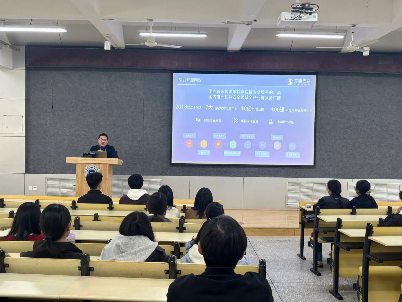 本网讯(文/图 缪学笛)为搭建校企协同育人平台,帮助学生对接职场、明晰职业方向,3月27日,437必赢会员中心特邀开源网安公司在6113教室开展实习招聘宣讲会。本次宣讲会由吕成志博士主持,学院党委书记曾小岩出席并讲话,公司销售总监袁晨主讲,437必赢会员中心大三、大四学生踊跃参与。