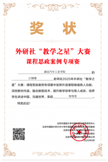 近日,2025年外研社“教学之星”大赛课程思政案例专项赛获奖名单公布,437必赢会员中心教师江婧璠荣获主赛道特等奖。